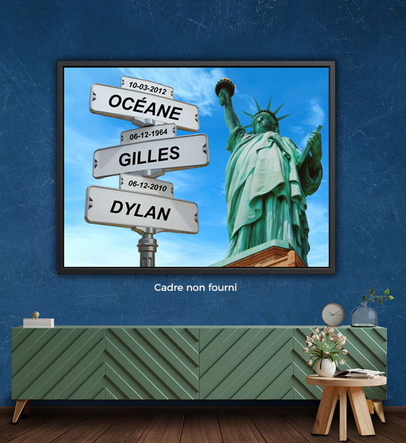 La présence de la Statue de la Liberté renforce l’identité du tableau. Ce repère visuel évoque immédiatement la ville de New York. La décoration murale s’appuie sur une référence connue. Les intersections rappellent l’organisation de la circulation. Les préoms de famille personnalisent l’ensemble. Le tableau gagne en cohérence graphique. Il attire naturellement l’attention. Le rendu reste équilibré. Cette création s’intègre à des intérieurs contemporains. Elle répond à une recherche décorative ciblée.