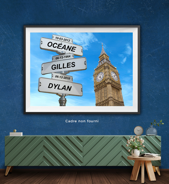 Les préoms de famille donnent une dimension personnelle au tableau. Chaque direction devient un repère visuel. La décoration murale gagne en signification. Les références à la circulation apportent une structure claire. La ville de Londres sert de toile de fond. La silhouette de Big Ben affirme l’identité. Le tableau trouve sa place au sein d’un foyer. Il valorise les liens familiaux. Le graphisme reste équilibré. Cette création répond à une recherche de personnalisation décorative.