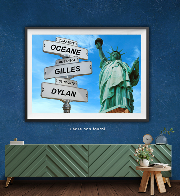 La présence de la Statue de la Liberté renforce l’identité du tableau. Ce repère visuel évoque immédiatement la ville de New York. La décoration murale s’appuie sur une référence connue. Les intersections rappellent l’organisation de la circulation. Les préoms de famille personnalisent l’ensemble. Le tableau gagne en cohérence graphique. Il attire naturellement l’attention. Le rendu reste équilibré. Cette création s’intègre à des intérieurs contemporains. Elle répond à une recherche décorative ciblée.