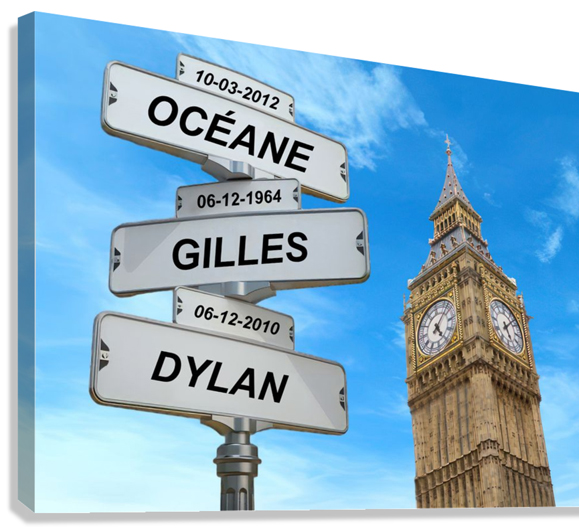 Les préoms de famille donnent une dimension personnelle au tableau. Chaque direction devient un repère visuel. La décoration murale gagne en signification. Les références à la circulation apportent une structure claire. La ville de Londres sert de toile de fond. La silhouette de Big Ben affirme l’identité. Le tableau trouve sa place au sein d’un foyer. Il valorise les liens familiaux. Le graphisme reste équilibré. Cette création répond à une recherche de personnalisation décorative.